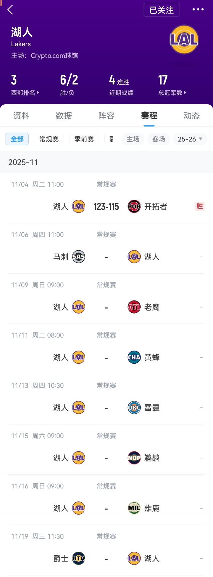 湖人队将于11月6日主场迎战马刺队,随后将在11月9日开始连续五场客场比赛。对手是:老鹰、黄蜂、雷霆、鹈鹕、雄鹿。那么11月19日湖人队将在主场迎战爵士队。